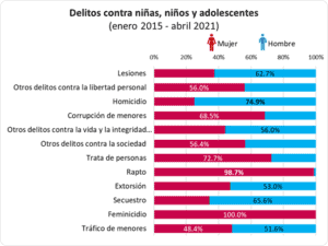 En los últimos siete años los niños y adolescentes hombres han sufrido más homicidios, secuestros y lesiones; en cambio las niñas y mujeres jóvenes han sufrido más la trata de personas (relacionada con la explotación sexual, que de acuerdo al estudio de la CDH en 2019, es la tercera actividad más lucrativa para las organizaciones criminales, después del tráfico de drogas y armas) y de corrupción a menores, además, niñas y adolescentes mujeres son casi la totalidad de víctimas de los raptos reportados en personas menores de 17 años desde 2015.