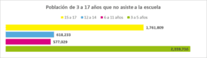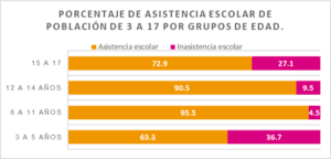 Sin embargo, de acuerdo con el Censo 2020 del Instituto Nacional de Estadística y Geografía (INEGI, 2021a), en México, 5.3 millones de personas de 3 a 17 años no asistían a la escuela, lo que corresponde al 16.5% de la población total menor de 18 años. Por grupos de edad, se observa lo siguiente: