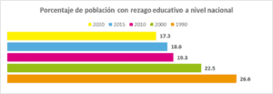 En particular, un evento altamente asociado con la inasistencia y deserción escolar es el rezago educativo. Este se entiende como la situación de atraso educativo de las personas con respecto al nivel educativo esperado según su edad o nivel de desarrollo. De igual manera, condiciones como la pobreza, desigualdad, exclusión social y del sistema educacional, además de la pauperización de la educación, entre otros factores, abonan a esta problemática (Muñoz, 2009). El rezago educativo tampoco es un problema menor. Al verlo en cifras, el rezago educativo en México ha llegado a afectar en los últimos 30 años a alrededor de la quinta parte de la población.