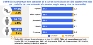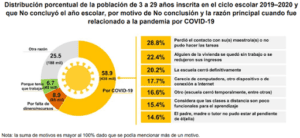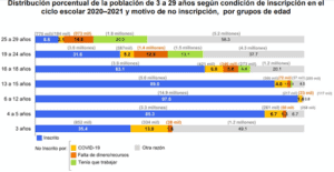 Las cifras oficiales señalan que 33.6 millones de personas entre los 3 y 29 años estuvieron inscritas en el ciclo escolar 2019- 2020 (62.0% del total). De ellas, 740 mil (2.2%) no concluyeron el ciclo escolar: 58.9% por alguna razón asociada a la COVID-19 y 8.9% por falta de dinero o recursos, de acuerdo con el INEGI (2021b).